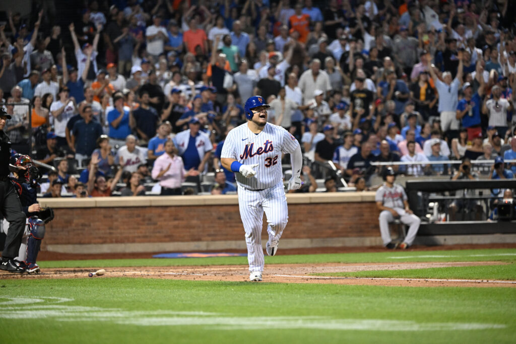 At 6-feet-tall and 270 pounds, Daniel Vogelbach was never going to stun people with his speed. But the big man from Orlando could mash. In his first 10 games after being acquired from Pittsburgh, Vogelbach had 10 hits, two of which were doubles and two more were home runs. His first was a grand slam as the Mets defeated the Washington Nationals on the road, 9-5. It was the eighth win for the Mets in nine games and part of a stretch where the team won 15 of 17 games. Vogelbach was the 11th Mets player to have his first long ball come with the bases loaded. “It’s easy to feel comfortable when you come into a team like this,” Vogelbach said. “Not just the players on the field, but the players off the field. It’s an easy clubhouse to come into.” The image is from a home run Vogelbach hit at home a week later.