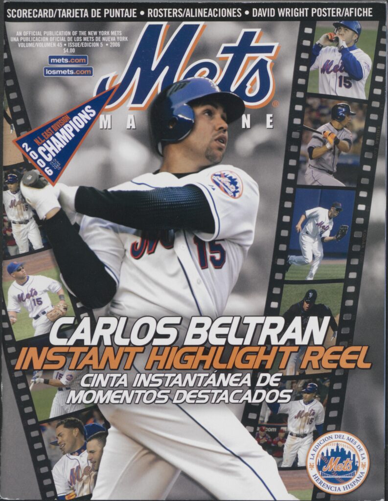Carlos Beltran had an incredible 2006 season with the Mets. The star center fielder tied a Mets franchise record with 41 home runs and finished fourth in the NL MVP voting. This bilingual scorecard, printed for National Hispanic Heritage Month, showcased some of Beltran’s best moments from the season.