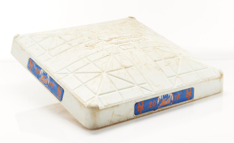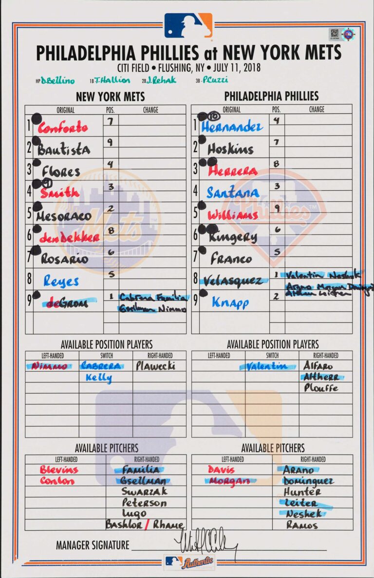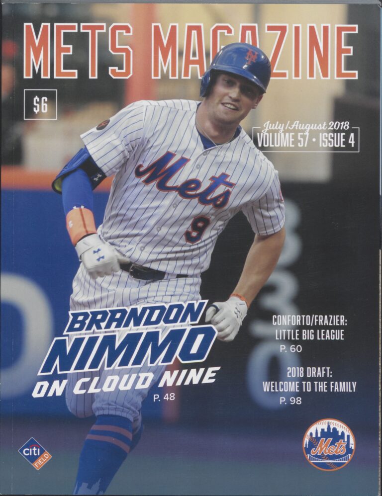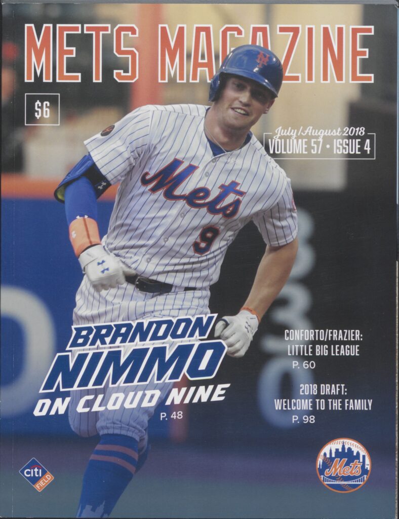 Brandon Nimmo’s pinch hit three-run home run in the 10th inning lifted the Mets to a 3-0 win over the Philadelphia Phillies. “You’re just floating, it’s hard to describe,” said Nimmo. “I mean, all the hairs on the back of your neck are standing up and I was extremely elated.” This was the lineup card from that game and Nimmo happened to be on the cover of “Mets Magazine” at the time. The win earned the Mets a series split with the Phillies – a series that started with Wilmer Flores hitting a pinch hit walk-off homer. The base pictured is from Flores’s game. Flores was the 18th pinch hitter to have a walk-off home run in club history and Nimmo the 19th. On July 6, Jose Bautista became the eighth Met to have a walk-off grand slam in a 5-1 win over the Tampa Bay Rays.